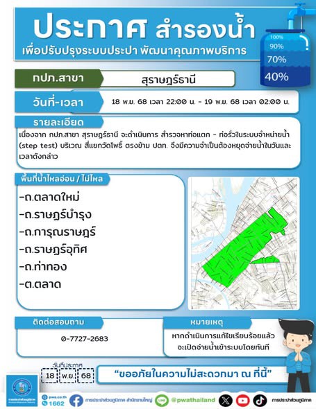 จึงขอความร่วมมือลูกค้าสำรองน้ำไว้ใช้ให้เพียงพอหากดำเนินการแล้วเสร็จ กปภ.จะเปิดจ่ายน้ำตามปกติในทันที ส่วนพื้นที่โซนสูงและ/หรือปลายเส้นท่อ อาจพบปัญหาน้ำไหลอ่อนหรือไม่ไหล ทั้งนี้ จนกว่าน้ำจะเต็มระบบเส้นท่อ กปภ.สาขาสุราษฎร์ธานี(พ) ขออภัยในความไม่สะดวกมา ณ โอกาสนี้