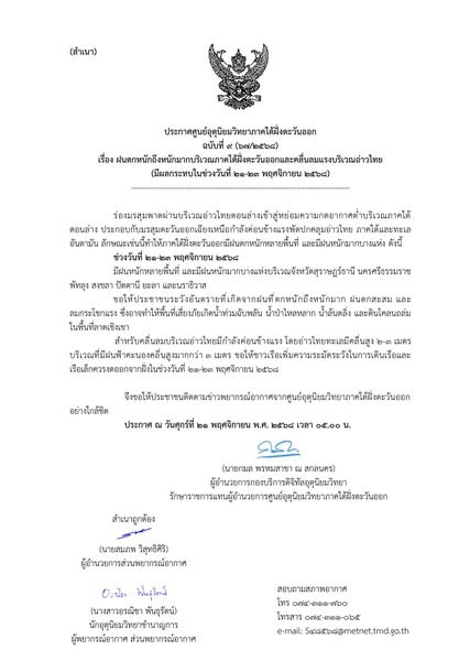 เรื่อง ฝนตกหนักถึงหนักมากบริเวณภาคใต้ฝั่งตะวันออกและคลื่นลมแรงบริเวณอ่าวไทย