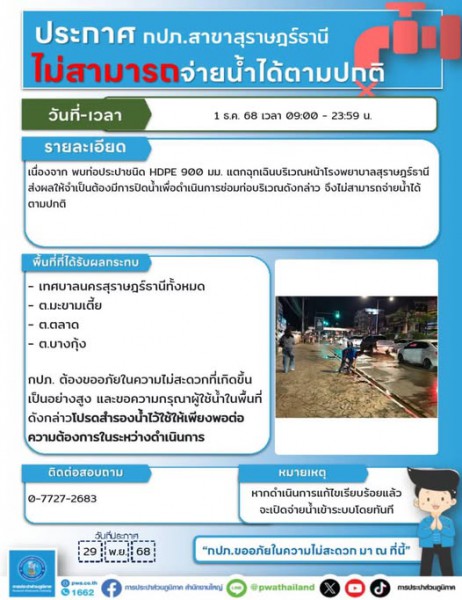 กปภ.สาขาสุราษฎร์ธานี(พ) ขอเรียนแจ้งให้ทราบว่า ได้เกิดเหตุท่อประปาชนิด HDPE ขนาด 900 มิลลิเมตร แตกฉุกเฉิน บริเวณหน้าโรงพยาบาลสุราษฎร์ธานี