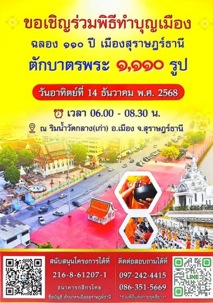 - สุราษฎร์ธานีจัดใหญ่! ทำบุญเมืองฉลอง 110 ปี ตักบาตรพระ 1,110 รูป วันที่ 14 ธันวาคม 2568