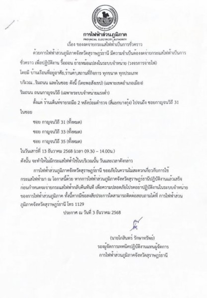 การไฟฟ้าส่วนภูมิภาคจังหวัดสุราษฎร์ธานี ขออภัยในความไม่สะดวกเกี่ยวกับการใช้กระแสไฟฟ้ามา ณ โอกาสนี้ด้วย หากการไฟฟ้าส่วนภูมิภาคจังหวัดสุราษฎร์ธานีปฏิบัติงานแล้วเสร็จก่อนกำหนดจะจ่ายกระแสไฟฟ้ากลับคืนทันที เพื่อความปลอดภัยโปรดอย่าปฏิบัติงานในระบบจำหน่ายของการไฟฟ้าส่วนภูมิภาค