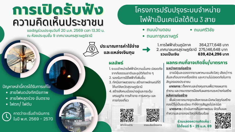 • การเปิดรับฟังความคิดเห็นประชาชน ขอเชิญร่วมประชุมวันที่ 20 ม.ค. 2569 เวลา 13.30 น. ณ ห้องประชุมชั้น 9 เทศบาลนครสุราษฎร์ธานี
