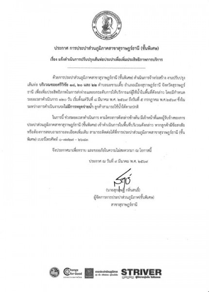 ประกาศปรับปรุงเส้นท่อประปา บริเวณซอยศรีวิชัย 18, 20 และ 22
