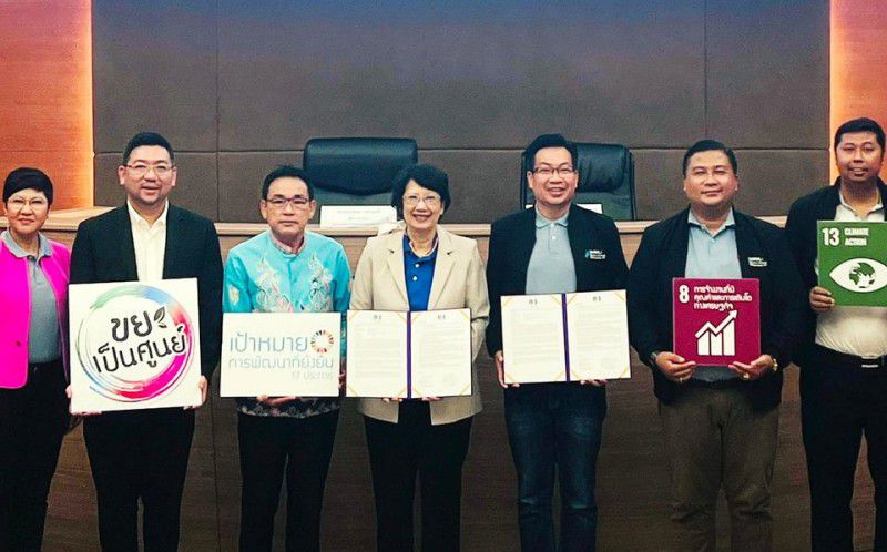 วันที่ 5 สิงหาคม 2565 เทศบาลนครสุราษฎร์ธานี โดยนายประเสริฐ บุญประสพ นายกเทศมนตรีนครสุราษฎร์ธานี มอบหมายให้นายรักพงษ์ แซ่ตั้ง รองนายกเทศมนตรี และนางสาวสิญานี เรืองนรา หัวหน้าฝ่ายบริการสิ่งแวดล้อม สำนักสาธารณสุขและสิ่งแวดล้อม เข้าร่วมเป็นสักขีพยานในพิธีลงนามบันทึกข้อตกลงความร่วมมือระหว่างมหาวิทยาลัยราชภัฎสุราษฎร์ธานี และโครงการพัฒนาแห่งสหประชาชาติ (United Nations Development Programe : UNDP) เพื่อเป็นการเสริมสร้างกรอบความร่วมมือในการดำเนินงานให้บรรลุวัตถุประสงค์ของโครงการที่มหาวิทยาลัยราชภัฎสุราษฎร์ธานีได้เข้าร่วม คือ"โครงการแก้ปัญหาเชิงนวัตกรรมเพื่อพัฒนาธนาคารขยะ ในจังหวัดสุราษฎร์ธานี" (โครงการธนาคารขยะเพื่อชุมชนต้นแบบ : สถานีที่ตอบสนองต่อเป้าหมายการพัฒนาอย่างยั่งยืน (SDG Station) ซึ่งโครงการนี้มีวัตถุประสงค์หลักเพื่อเสริมสร้างศักยภาพในการจัดการขยะอย่างยั่งยืนของมหาวิทยาลัยราชภัฎสุราษฎร์ธานี และเพื่อนำร่องให้เกิดการขยายผลการดำเนินการไปสู่ระดับเมือง โดยมี ผศ.ดร.วัฒนา รัตนพรหม รักษาราชการแทนอธิการบดี มหาวิทยาลัยราชภัฎสุราษฎร์ธานี และผู้แทนโครงการพัฒนาแห่งสหประชาชาติ (UNDP) ร่วมลงนาม, ผู้แทนธนาคารออมสิน และผู้แทนคาร์กิลล์ ประเทศไทย ร่วมเป็นพยาน ณ ห้องประชุมเฟื่องฟ้า มหาวิทยาลัยราชภัฎสุราษฎร์ธานี