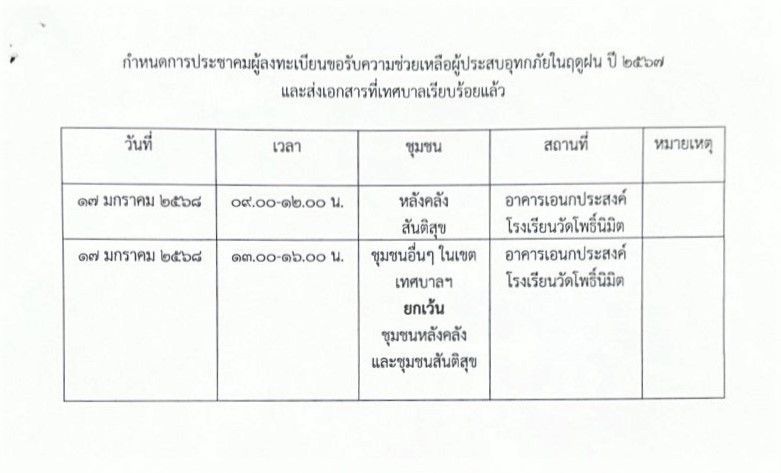 ด้วยประชาชนมาลงทะเบียนผู้ขอรับความช่วยเหลือผู้ประสบอุทกภัยในฤดูฝน ปี 2567 เพิ่มเติม ตามมติคณะรัฐมนตรีฯ และเทศบาลนครสุราษฎร์ธานีต้องจัดประชาคมเพื่อรับรองรายชื่อฯ จึงขอให้ผู้ที่ลงทะเบียนและส่งเอกสารที่เทศบาลเรียบร้อยแล้ว มาประชาคมพร้อมกัน