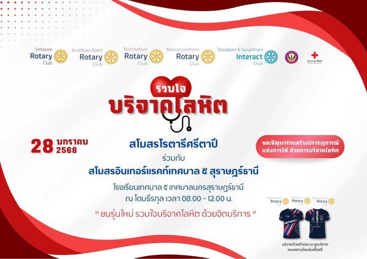 สโมสรอินเทอร์แรคท์เทศบาล ๕ สุราษฎร์ธานี ขอเชิญร่วมบริจาคโลหิต ในวันที่ 28 มกราคม 2568 เวลา 08.00-12.00 น. ณ โดมธีรกุล โรงเรียนเทศบาล ๕ เทศบาลนครสุราษฎร์ธานี