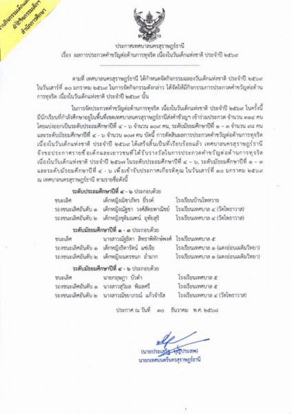 เรื่อง ผลการประกวดคำขวัญต่อต้านทุจริต เนื่องในวันเด็กแห่งชาติ ประจำปี 2569
