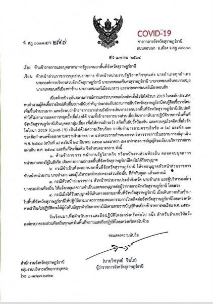 ห้ามข้าราชการและบุคลากรภาครัฐออกนอกพื้นที่ จังหวัดสุราษฎร์ธานี