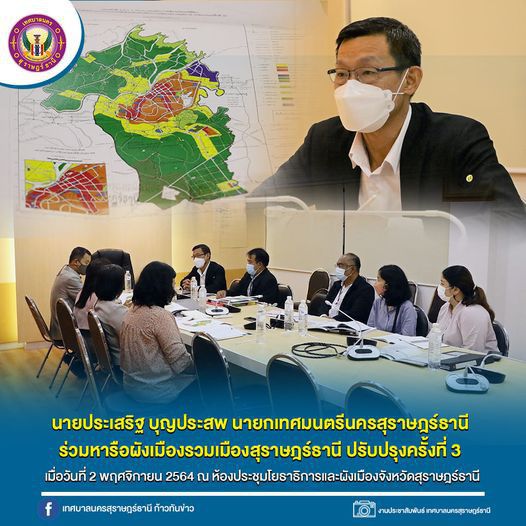 เมื่อวันที่ 2 พฤศจิกายน 2564 ณ ห้องประชุมสำนักงานโยธาธิการและผังเมืองจังหวัดสุราษฎร์ธานี เทศบาลนครสุราษฎร์ธานี โดยนายประเสริฐ บุญประสพ นายกเทศมนตรีนครสุราษฎร์ธานี พร้อมเจ้าหน้าที่ที่เกี่ยวข้อง ร่วมหารือกับสำนักงานโยธาธิการและผังเมืองจังหวัดสุราษฎร์ธานี โดยนายกุมพล พฤฒิพฤกษ์ โยธาธิการและผังเมืองจังหวัดสุราษฎร์ธานี พร้อมเจ้าหน้าที่ที่เกี่ยวข้อง เพื่อหาแนวทางและขั้นตอนการดำเนินการจัดทำผังเมืองรวมเมืองสุราษฎร์ธานี (ปรับปรุงครั้งที่ 3) ให้เป็นไปตามพระราชบัญญัติการผังเมือง พ.ศ.2562
