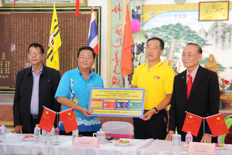 เทศบาลนครสุราษฎร์ธานี โดยนายธีระกิจ หวังมุทิตากุล นายกเทศมนตรีนครสุราษฎร์ธานี รับมอบป้าย พร้อมกล่าวขอบคุณ Mr.Ma Feng chun กงศุลใหญ่สาธารณรัฐประชาชนจีนประจำสงขลา